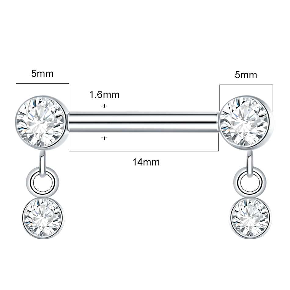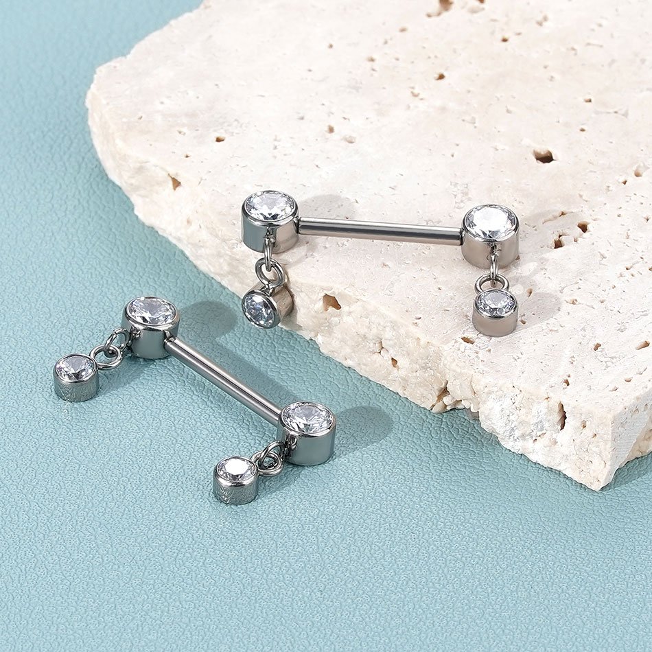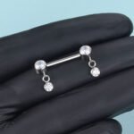 Nuestra nueva incorporación para nipple piercing redefine la elegancia. Un diseño pensado para quienes buscan algo más que una joya básica: simetría perfecta coronada con Zirconias Premium y dijes colgantes que acompañan cada movimiento con un destello único.